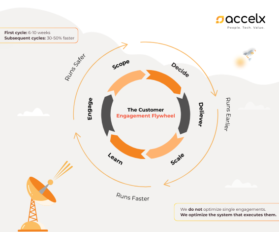A healthy flywheel for AWS typically has stages such as Engage, Scope, Decide, Deliver, Scale, Learn. The first 6-10‑week cycle proves that you can run AWS work earlier, faster, and safer-by improving the quality of decisions before heavy investment, not after. Subsequent cycles run significantly faster because more of the system is known, patterns are reused, and failure signals are wired into the way you work.